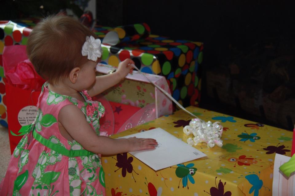 Not only was I responsible for watching and caring for Belle, but I was throwing her an early 1st Birthday Party Sunday afternoon, as well. I finished decorating and picked up the Cinsational Sweet Treats cupcakes from Jen Hardin, a friend of mine from Junior League while Belle was still sleeping. Also somethign I could not have managed without the help of my parents. Her parents walked in the door and I don’t know if I’ve ever been so grateful and so sad at the same time. I really enjoyed taking care of her, but was glad that they were home. Belle took one look at Becky and crawled as fast as she could straight to her. Our cousins and family slowly arrived for the party. We took a picture of the 4 Hayden Great-Grandchildren to send to my grandparents and had a lovely day celebrating Belle’s first 1st birthday party.