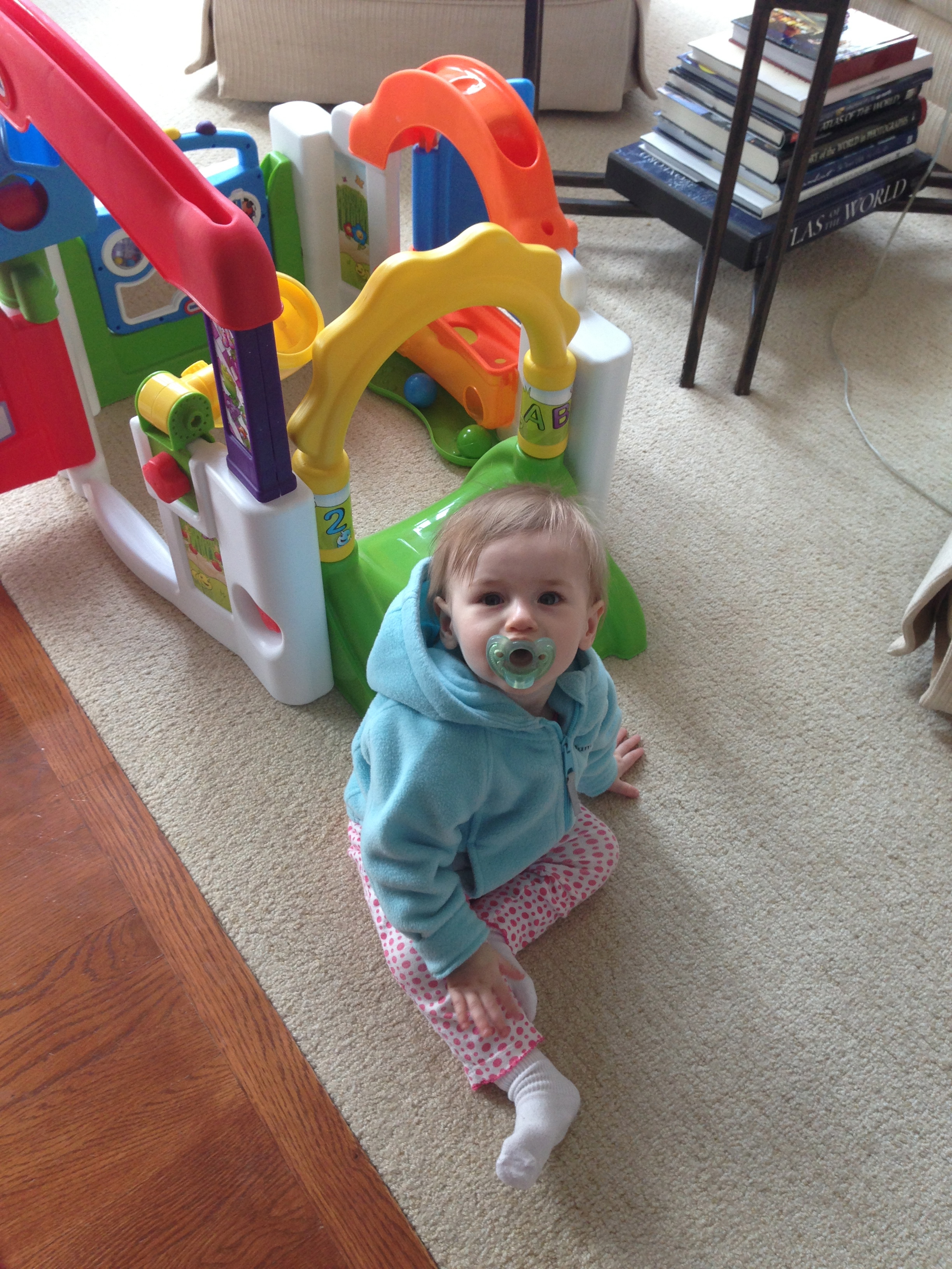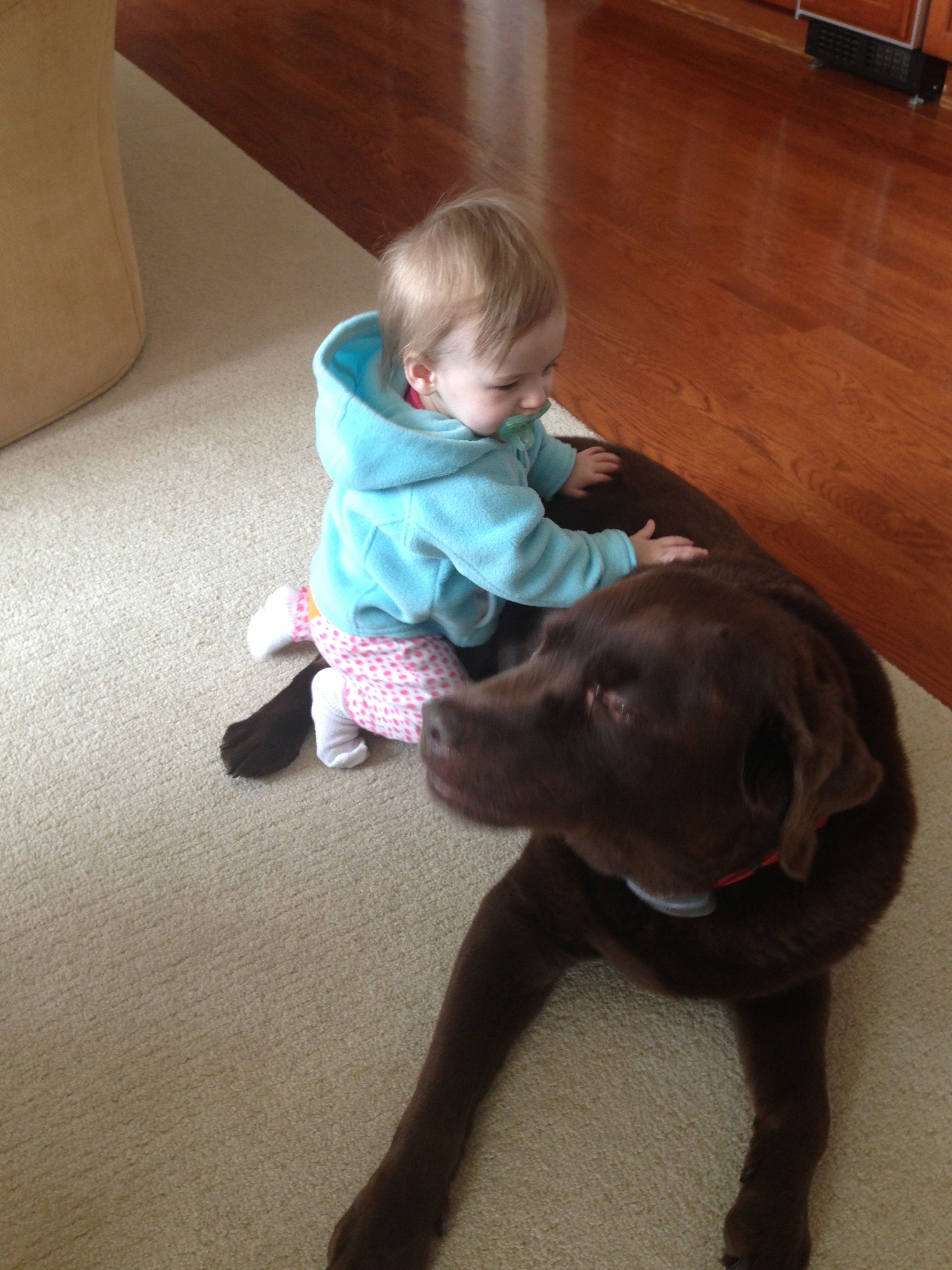 She has a variety of toys that make all kinds of sounds that make her giggle. She’s incredibly amused by them and I am easily amused by her. I’m thinking to myself, “Wow this is going pretty well. I could totally do this!” Belle especially loves dogs. She played with Cooper, my parents’ chocolate lab, for awhile. He can be grumpy at times but is surprisingly good with her.