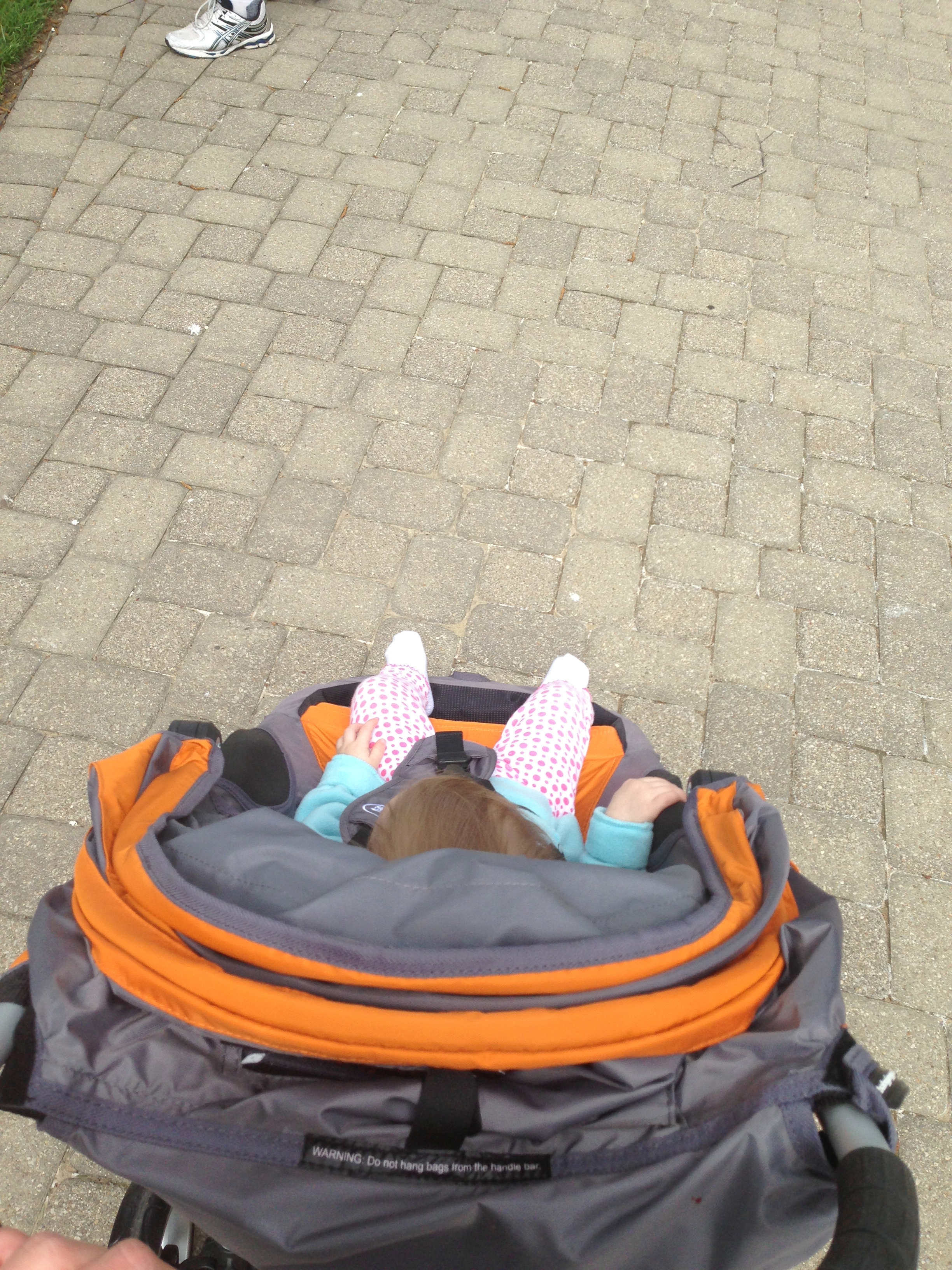 She seemed to have calmed down by the time I got there, but was definitely happy to see me. She reached her arms out to me almost immediately. We put Belle in her stroller and my Dad and I took her for a walk around the neighborhood -get a little exercise, a little fresh air, occupy some time! She fell asleep almost immediately and when we returned, we let her continue to sleep in her stroller in the kitchen until she woke up. Never wake a sleeping baby or something like that, right?