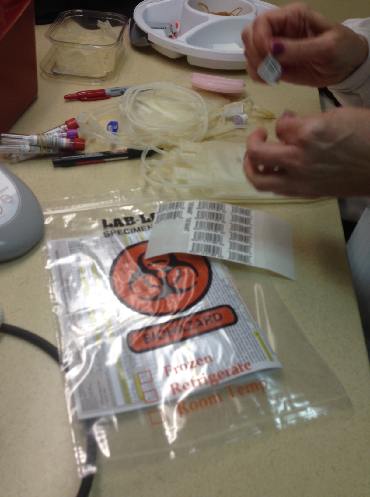 The next step is to clamp up Alice’s feeding tube. If you do not properly clamp these before opening or closing a port, both the contents of Alice’s stomach and the food entering it will pour out through the tube. I did pretty well the first time, but learned that the hard way upon closing her back up. Whoops.